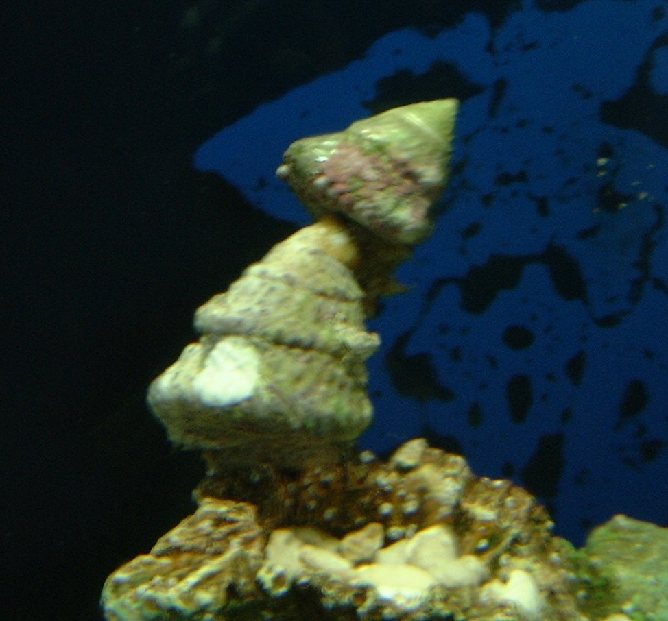 One astrea snail cleaning another. Date: 03-07-06 Turbo snail cleaning a turbo snail