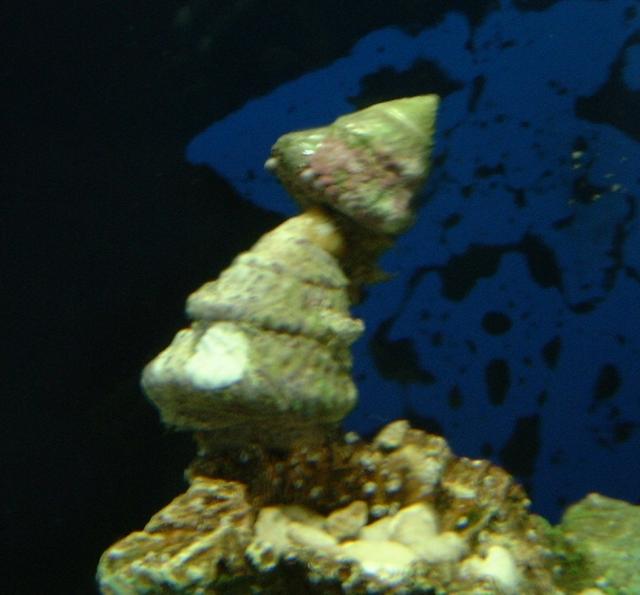 One astrea snail cleaning another. Date: 03-07-06 Turbo snail cleaning a turbo snail